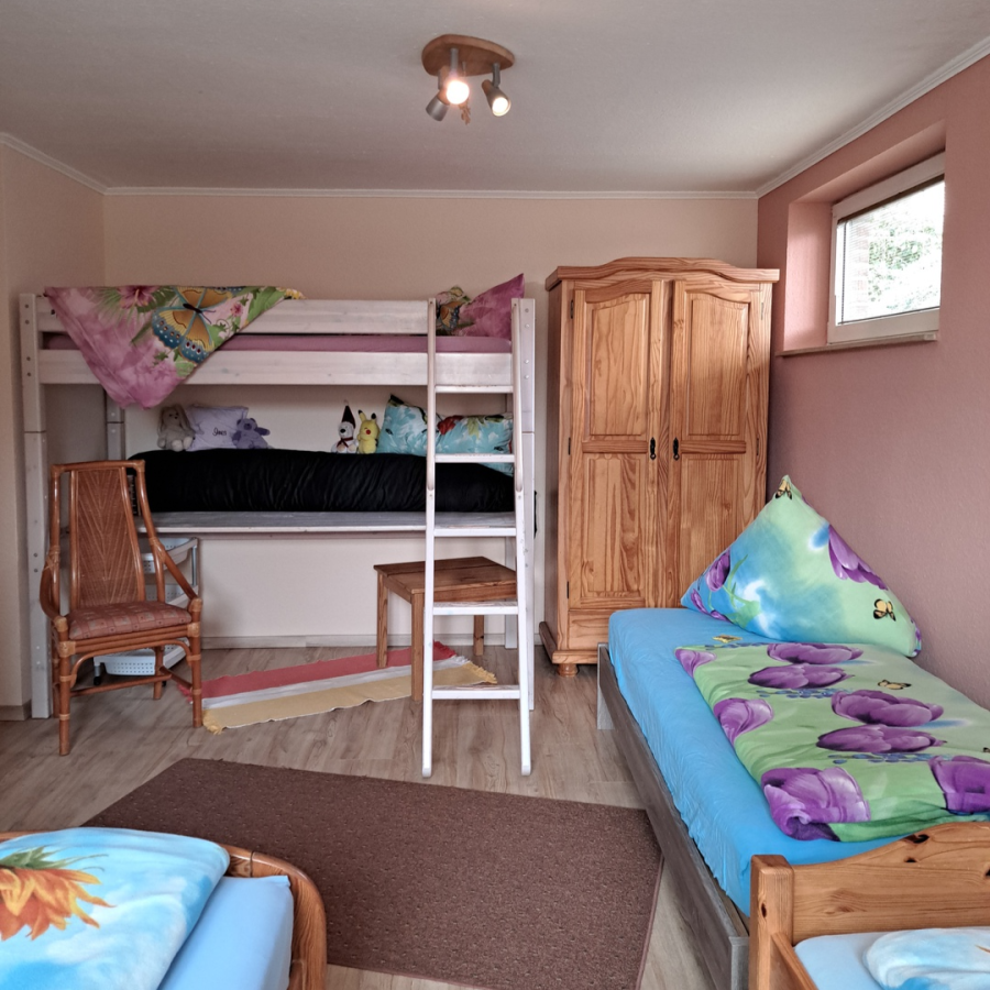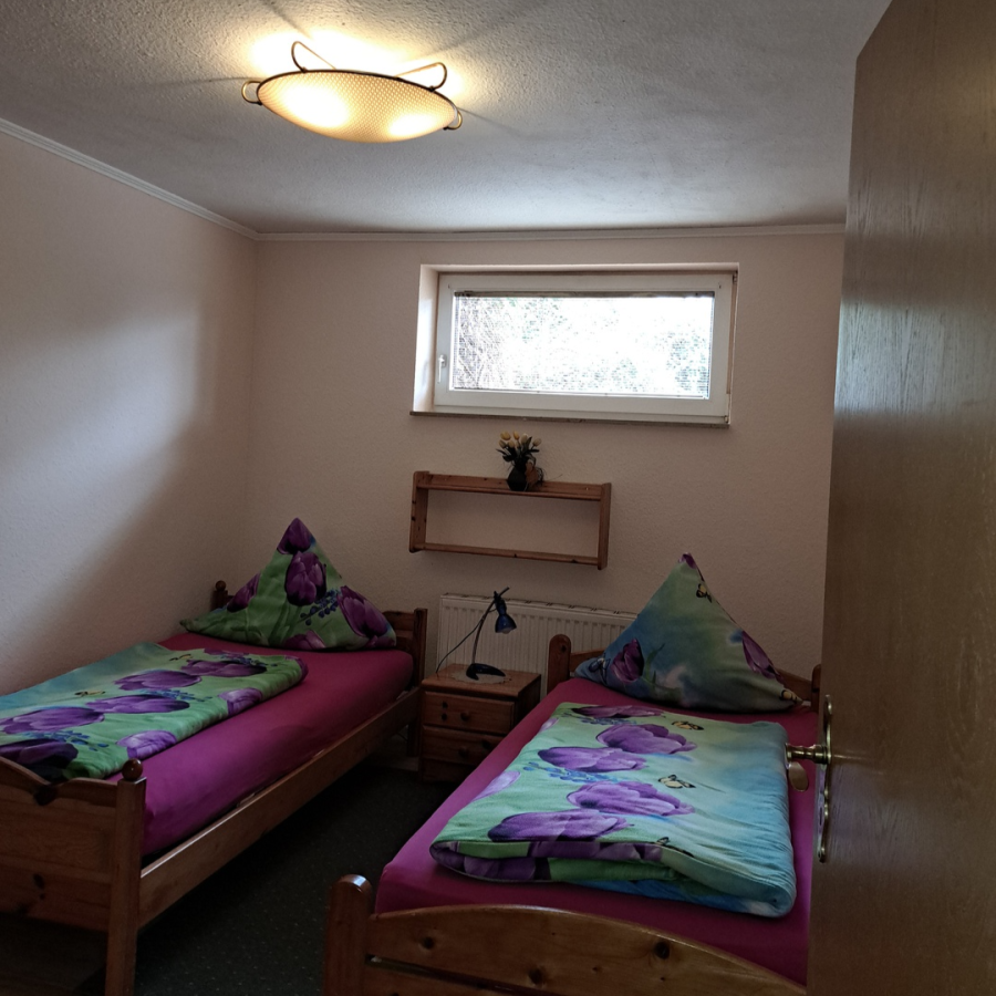 Der Zuschnitt im Untergeschoss und die Ausstattungsmerkmale sind der Wohnung 1 sehr ähnlich und bieten mit 3 Schlafräumen bis zu 8 Personen Platz. Mit den massiven Kiefernmöbeln, der zusätzlichen Ess- u./o. Spielecke und dem Hochbett mit Schreibtisch genießen Sie einen Einrichtugsstil, der besonders auch Familien mit Kindern anspricht. Eine gut ausgestattete Einbauküche mit Geschirrspüler, Gefrierschrank, Mikrowelle und allen nötigen Kleingeräten ist vorhanden. Ein modern eingerichtetes Wohnzimmer mit Laminatfußboden, Kaminofen, großer Essecke, Flat-TV mit Sat-Anschluss und Ausgang über die Terrasse in den Garten erwarten Sie. Ein weiterer Pluspunkt dieser Wohnung ist das zweite WC.