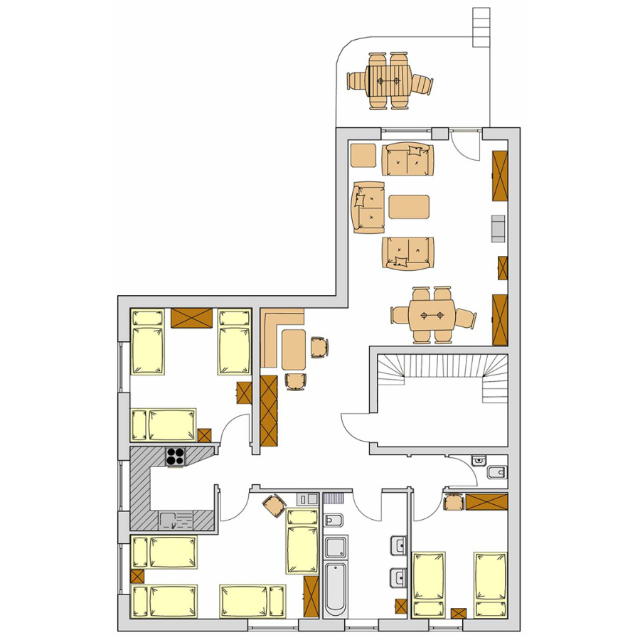 In dieser 2. Ferienwohnung haben Sie ca. 120 qm Wochfläche und 25 qm Terrassenfläche auf einer Ebene zur Verfügung.
